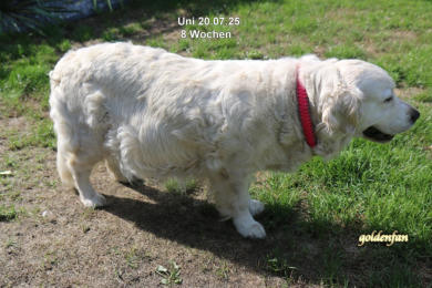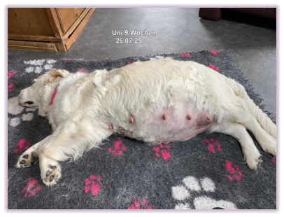 27.07. 64. Tag - 04.00 Uhr - die Temperatur ist fast wieder auf normal, sie buddelt in der Wurfkiste seit 9.00 Geburt - wir freuen uns über ein süßes Mädchen - rosa ein niedlicher Rüde - hellblau ein niedlicher Rüde - schwarz ein niedlicher Rüde - hellgrün ein niedlicher Rüde - dunkelblau ein niedlicher Rüde - lila ein süßes Mädchen - orange Nummer 8 und 9 - zwei kleine Rüden kamen nur als Engel auf die Welt, Wiederbelebung leider unmöglich Natur ist manchmal grausam Zur Zeit presst sie noch ein bisschen, vermutlich wegen 2 fehlender Nachgeburten - unser Tierarzt wird das noch kontrollieren - 17.00 Uhr - Futter wurde erneut verweigert, aber Zwieback mmmh - ihre Temperatur ist abfallend - 11.00 Uhr - am Futter wurde nur kurz nur geschnuppert, aktuelles Gewicht 43,5 kg - neues Foto 26.07. 63. Tag - 05.00 Uhr - eine sehr unruhige Nacht, sie hat viel gehechelt und viele Gartenrunden, gefuttert wurde wieder nur ihr ½ trockenes Brötchen - wenn es Neuigkeiten gibt, schreibe ich es 25.07. 62. Tag - nachts war sie sehr unruhig, morgens und mittags wollte sie nichts essen, nur den Nachtisch 1 Zwieback, ½ trockenes Brötchen die schmeckten ihr, heute Abend hat sie eine kleine Portion von ihrem Futter genommen 24.07. 61. Tag - noch gibt es keine Anzeichen, Temperatur ist noch konstant 23.07. 60. Tag - ihr Bauchumfang von 106 cm macht Liegen und Sitzen recht beschwerlich - nachts muß sie alle 2 Stunden raus, aber das ist normal, die Kleinen drücken halt auf die Blase 22.07. 59. Tag - ihre Temperatur ist sehr konstant, sie futtert zwar langsam, aber jeder Mikrokrümel wird vernichtet 21.07. 58. Tag - die Kleinen sind lebensfähig, aber noch genießen sie Mama Uni s Schutz - Unis Bauchfell haben wir etwas gekürzt, damit die Welpis nicht das Fell in ihre Mäulchen bekommen 20.07. aktuelles 8 Wochenfoto eingefügt, ihr Umfang ist auf 104 cm angewachsen und ihr Gewicht 43 kg 19.07. die Bewegungen der Kleinen zu spüren ist einfach ein unglaublich schönes Gefühl, nur Uni mag es nicht, wenn die Hand ruhig auf dem Bauch liegt, sie will gestreichelt werden - wir kontrollieren ihre Temperatur, sie ist schön gleichmässig, also geht es Mama und Welpis gut - ca. 24 Stunden vor der Geburt fällt diese um 1 Grad ab um dann kurz vor der Geburt wieder auf normal zu steigen 18.07. unter strenger Aufsicht haben wir heute die Wurfkiste zusammengebaut, puh alle waren mit uns zufrieden, morgen machen wir die noch kuschelig weich und dann ist alles für die Geburt fertig 17.07. Sie meint immer noch sie ist kurz vor dem Verhungern, Futter, Leckerlis mmmh aber zu viel ist einfach nicht gut für sie 16.07. ihr Umfang ist auf 100 cm angewachsen, nun kann sie sich nicht mehr putzen, das finde sie nicht so toll 15.07. sie ist etwas kurzatmig, aber das scheint ihr überhaupt nichts auszumachen 14.07. eine gemütliche Schlafposition zu finden, ist gar nicht mehr so einfach 13.07. aktuelles 7 Wochenfoto eingefügt - ihr Gewicht 40,0 kg bei einem Umfang von 97 cm 12.07. sie frißt etwas langsamer als normal, aber bei einem Umfang von 96,5 ist das verständlich 11.07. die Kleinen drücken etwas auf die Blase, deshalb muß Uni öfters ihren See machen 10.07. sie döst schon viel, aber sobald Jemand raschelt ist sie da es könnte doch was Leckeres geben 09.07. ihre tägliche Futtermenge wird jetzt auf die 3 Mahlzeiten gleichmässig verteilt, damit der Magen nicht zu voll wird 08.07. sie legt sich immer dahin wo es eng ist, z.B. Mitten im Türrahmen, das geht na klar gar nicht 07.07. Uni geht es prima, auch ihr süßes Bäuchlein mit 93 cm stört sie nicht 06.07. aktuelles 6-Wochenfoto eingefügt - ihr Gewicht 37 kg - Umfang 92 cm 05.07. sie versucht sich schon oft wegzuschleichen um zu buddeln, aber da wir sie immer im Blick haben klappt das na klar nicht 04.07. ihre Mama Tascha hatte Geburtstag und da gab es natürlich für alle besonders viele Leckerlis, das fand Uni sehr sehr toll 03.07. ihre Futterportion schafft sie noch spielend, wobei sie Mittags immer erst kontrolliert ob die leckere spezielle Kräutermischung wirklich dabei ist - die unterstützt Mama und Welpis während der Trächtigkeit und Geburt 02.07. puh diese Hitze, da macht der Aufenthalt draußen kein Spaß mehr - alle dösen drinnen - Umfang 91 cm 01.07. auf dem Sessel liegen findet sie schon nicht mehr so angenehm und macht es deshalb nur noch kurz 30.06. Uni geht es sehr gut - ihr Umfang beträgt 89 cm 29.06. aktuelles 5-Wochenfoto eingefügt- Waage schwankte zwischen 35 und 35,5 kg 28.06. ihren Napf leert sie immer blitzeblank - Umfang 88 cm 27.06. ihr Gesäuge bildet sich langsam aus, Umfang 85 cm 26.06. die Hitze mag sie gar nicht, sie liegt dann im Schatten unterm Baum oder geht ins Haus 25.06. seit heute bekommt sie Welpenfutter, das ist sooo lecker und wie immer viel zu wenig - Bauchumfang beträgt 83 cm ( immer während des Futterns gemessen, sonst zieht sie den Bauch ein) 24.06. Uni geht es prima, sie döst schon meistens abseits von den anderen 23.06. Unis Trächtigkeit wurde durch Ultraschall bestätigt 16.06. Ultraschalltermin ist am 23.06. um 15.00 Uhr 15.06. aktuelles 3-Wochenfoto eingefügt, sie wiegt 35 kg - Bauchumfang 82 cm Morgen werden wir einen Ultraschalltermin festlegen 08.06. aktuelles 2-Wochenfoto eingefügt, sie wiegt 34,5 kg - Bauchumfang 81 cm 01.06. aktuelles 1-Wochenfoto eingefügt, sie wiegt 34 kg - Bauchumfang 80 cm 26.05. heute hat es zwar nicht richtig geklappt, aber es war trotzdem schön zu sehen, was für ein harmonisches Paar die beiden sind, bis zur Bestätigung per Ultraschall in ca. 4 Wochen, gibt es nur jeden Sonntag ein aktuelles Foto von Uni 25.05. Uni hat sich diesmal für Jupiter entschieden, beide mochten sich sehr gern und feiern Hochzeit 14.05. Uni wird läufig