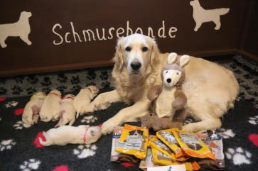 Tia stammt aus einer wirklichen Topverpaarung - wie ihre Eltern Tascha und Robin besitzt sie ein sanftes, sehr aufgewecktes, unerschrockenes Wesen. Sie hat sich inzwischen zu einer wunderschönen Hündin mit tollen Gesundheitsergebnissen entwickelt.Sie ist sehr verspielt und apportiert total gern, Tia ohne Beute gibt es selten. Draußen ist jedes Stöckchen ihres und drinnen ihre Spielis und Decken (natürlich ordentlich von ihr zusammengelegt) Tia hat keinerlei Allergien oder Unverträglichkeiten - ihr cremefarbenes Fell besitzt unglaublich viel Unterwolle - sie ist inzwischen ein perfektes Ebenbild ihrer Mama Tascha, mit einer Besonderheit - ein kleiner senkrechter, total niedlicher Wirbel zwischen den Augen.Im T- Wurf hatte sie ein gelbes Halsband, da gibt es noch viele weitere Fotos von Tia und ihren Geschwistern.Januar 2019 wurde ein großes Blutbild sowie ein Ultraschall gemacht - alle Werte (incl. Schilddrüse) waren im grünen Bereich.Folgende freiwillige Gentests wurden bei Laboklin gemachtprcd-PRA (Partnerlabor) - PCR (Augen) Ergebnis: Genotyp N/N (A) freiInterpretation: Das untersuchte Tier ist reinerbig (homozygot) für das Wildtyp-Allel.Es trägt somit nicht die ursächliche Mutation für die prcd-PRA im PRCD-Gen.Sie selbst kann diese Krankheit nicht bekommen und auch nicht vererbenProgressive Retinaatrophie (GR_PRA1) - PCR (Augen) Ergebnis: Genotyp N/N freiInterpretation: Das untersuchte Tier ist reinerbig (homozygot) für das Wildtyp-Allel. Es trägt somit nicht die ursächliche Mutation für GR_PRA1 im SLC4A3-Gen. Sie kann diese Krankheit nicht bekommen und auch nicht vererbenProgressive Retinaatrophie (GR_PRA2) - PCR (Augen) Ergebnis: Genotyp N/N freiInterpretation: Das untersuchte Tier ist reinerbig (homozygot) für das Wildtyp-Allel.Es trägt somit nicht die ursächliche Mutation für GR_PRA2 im TTC8-Gen.Sie kann diese Krankheit nicht bekommen und auch nicht vererbenDegenerative Myelopathie - PCR ( Nerven) Ergebnis: Genotyp N/N(Exon2) freiInterpretation: Das untersuchte Tier ist reinerbig (homozygot) für das Wildtyp-Allel.Es trägt somit nicht den Hochrisikofaktor für DM im Exon 2 des SOD1-GensSie kann diese Krankheit nicht bekommen und auch nicht vererbenIchthyose - PCR (Schuppen) Ergebnis: Genotyp N/Ich TrägerInterpretation: Das untersuchte Tier ist Anlageträger (heterozygot) für die ursächliche Mutation für Ichthyose im PNPLA1-Gen.Sie selbst kann diese Krankheit (Schuppen) nicht bekommen,könnte aber Schuppen vererben, wenn der Rüde nicht frei istMuskeldystrophie (MD) - PCR (Muskeln) Ergebnis: Genotyp weiblich X(N)/X(N), männlich X(N)/Y freiInterpretation: Das untersuchte Tier ist reinerbig (homozygot) für das Wildtyp-Allel.Es trägt somit nicht die ursächliche Mutation für GRMD im Dystrophin-Gen.Sie kann diese Krankheit nicht bekommen und auch nicht vererbenRöntgenbefund am 03.05.2018HD - B1/B1 (fast normal = frei) ED - 0/0 (frei)Zuchtzulassung ohne Auflagen am 10.06.2018 erhalten
